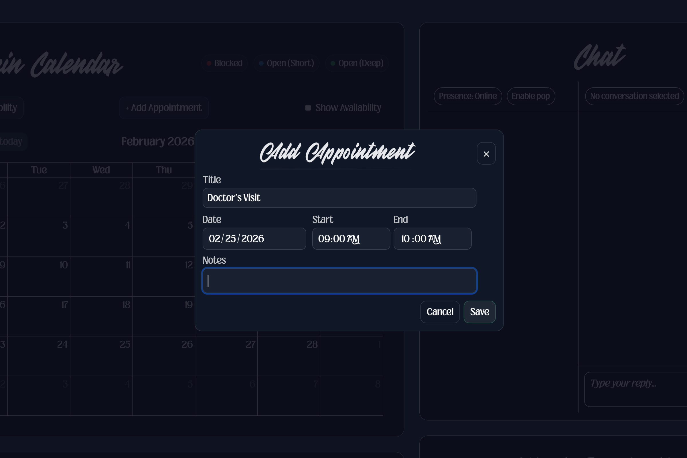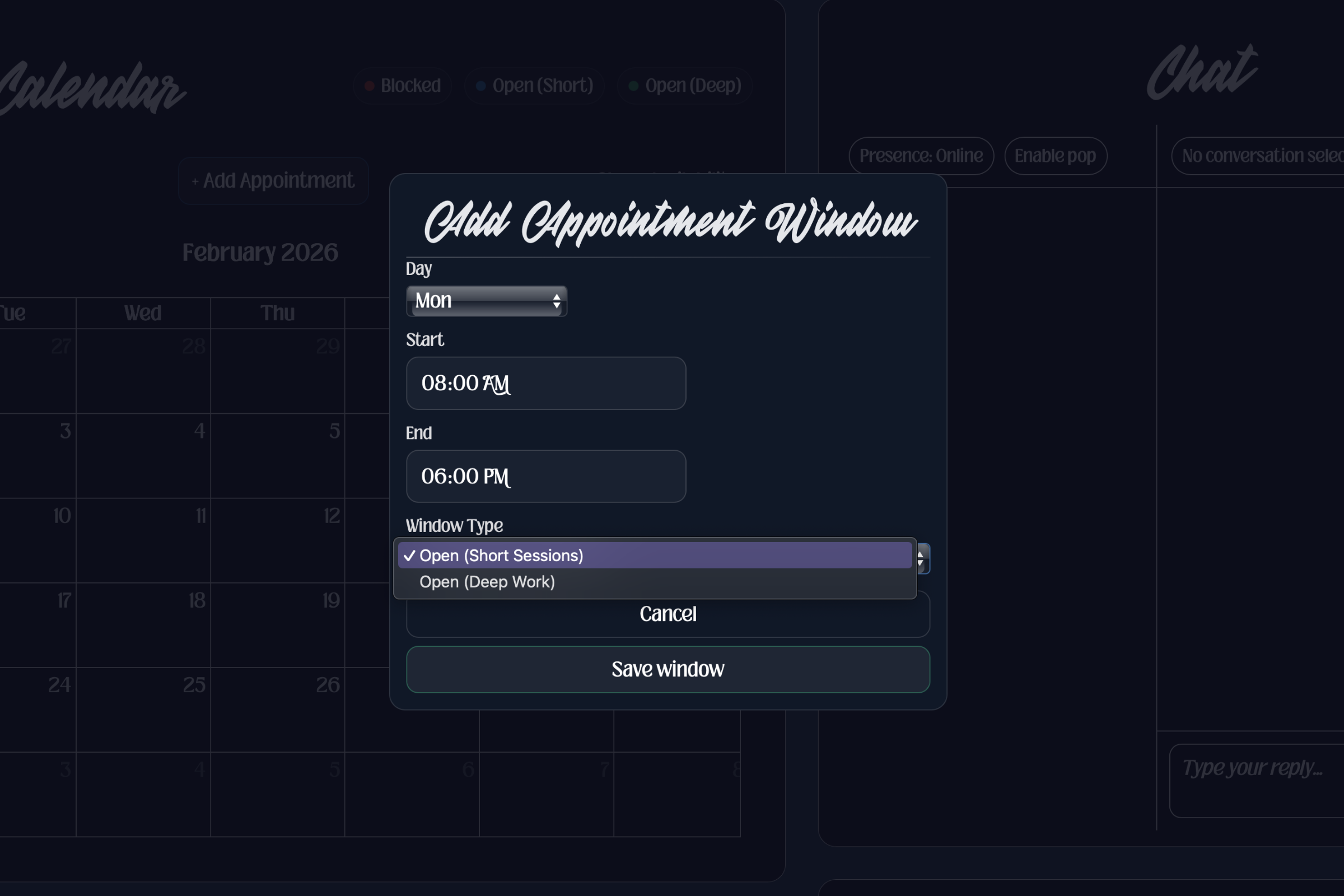 In the image below, you can see what it looks like on my end when I am adding availability. I have divided my available time into two different types: short and deep.