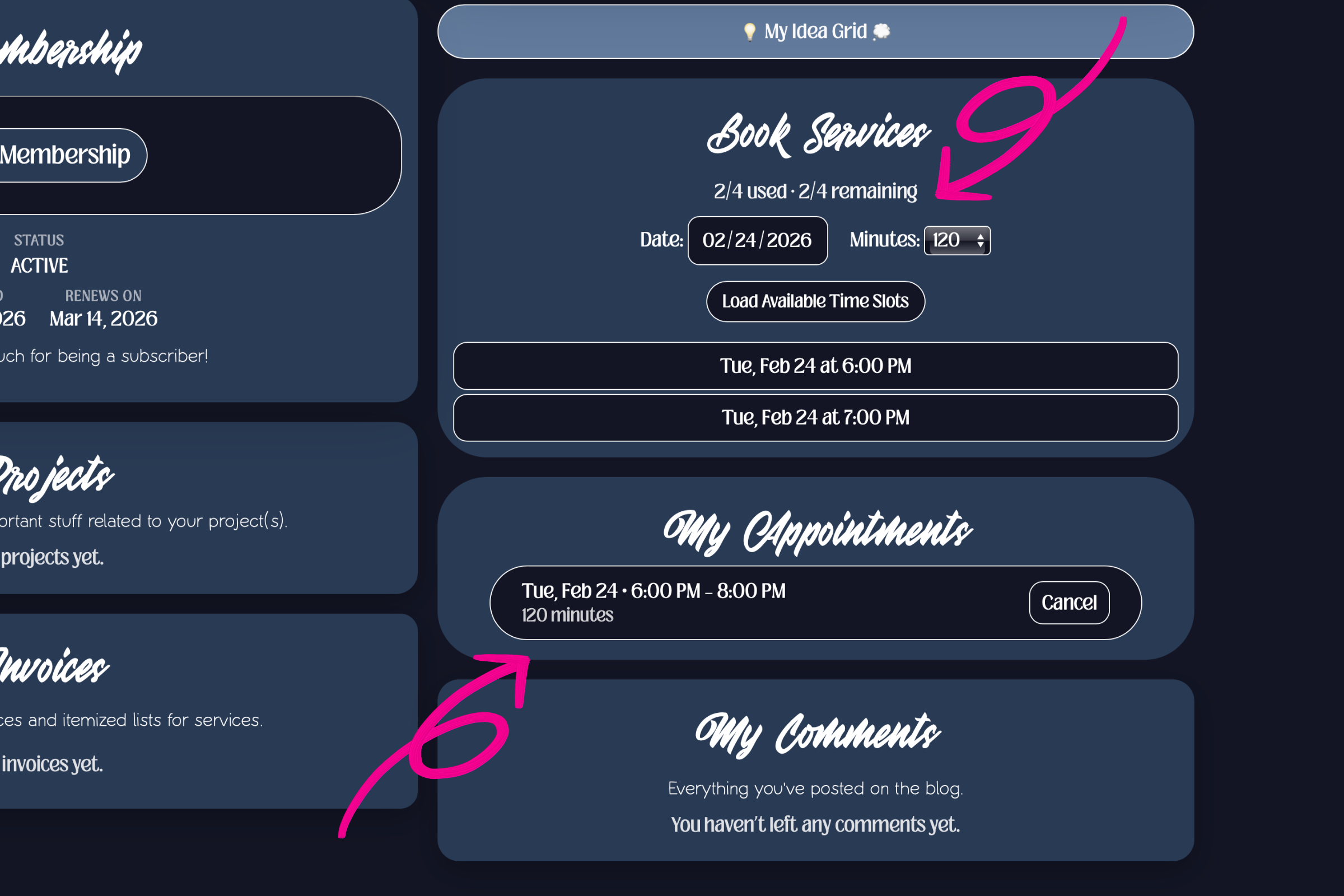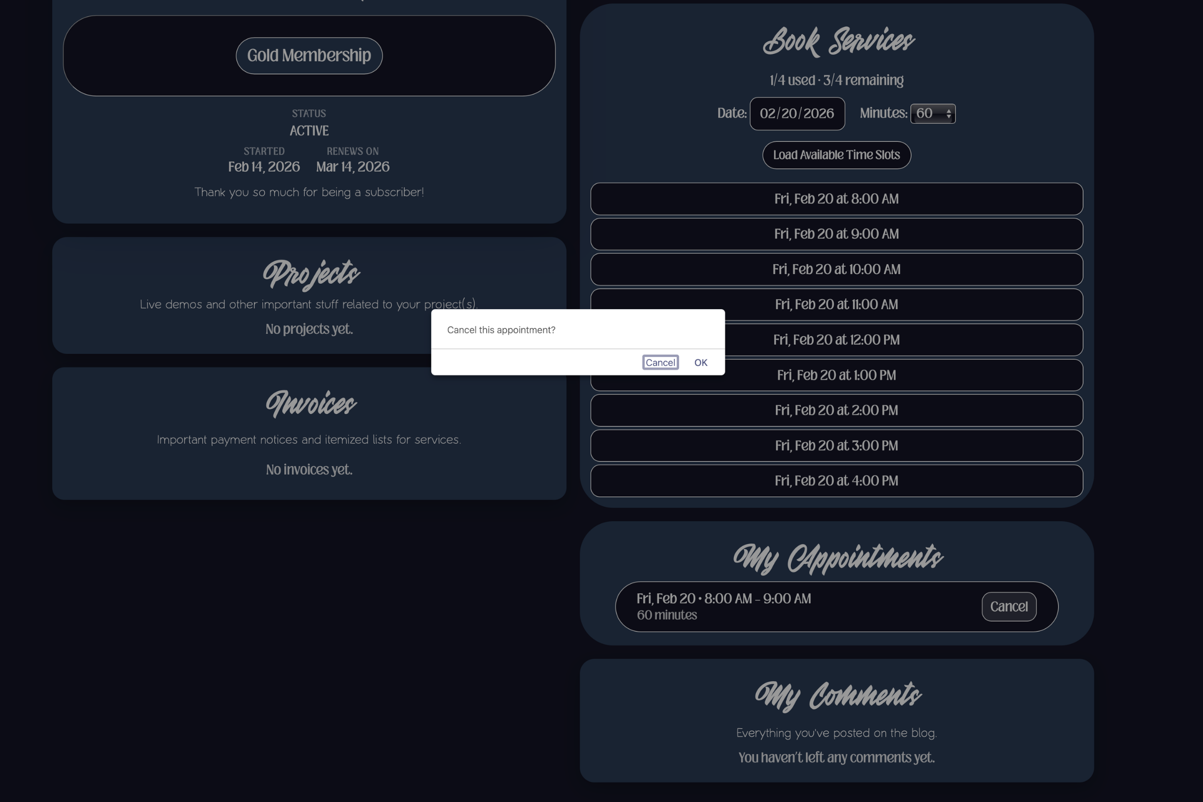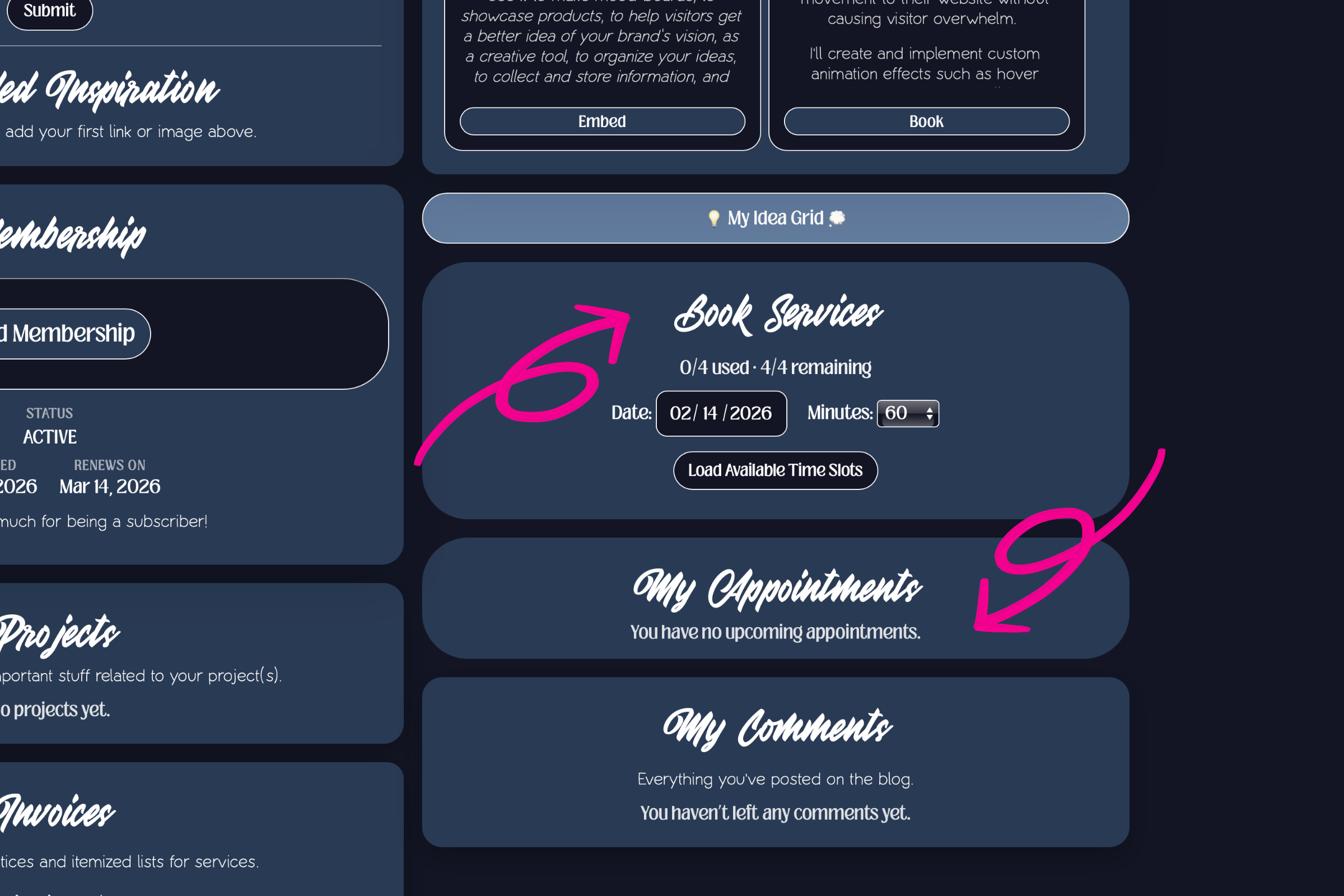 It was very important to me that the user was able to immediately use their subscription benefits. I believe that in the modern world, the expectation is that things will be fast and seamless. I wanted to provide that experience for my clients and I believe that it sets me apart. Because I sell website services, I needed to develop a system that would let the user set their appointment immediately and manage it from their dashboard. So, I created a token system and tied it to my calendar. In the image above, notice that the user is able to see the date their subscription started and the day it renews. Also notice that in the "book services" section there is now a meter displaying 0/4 used and 4/4 remaining. This denominator represents the total number of booking credits that the subscription entitles the user to. In the "book services" section, they are also given a similar interface to one that was discussed in part one. It is almost identical to the flow that occurs after somebody purchases a digital service. The only difference is that in this one, the user is asked to provide the length of their appointment in addition to providing a date that works for them. Once those details are added, the dashboard pulls up a list of available time slots for that day.