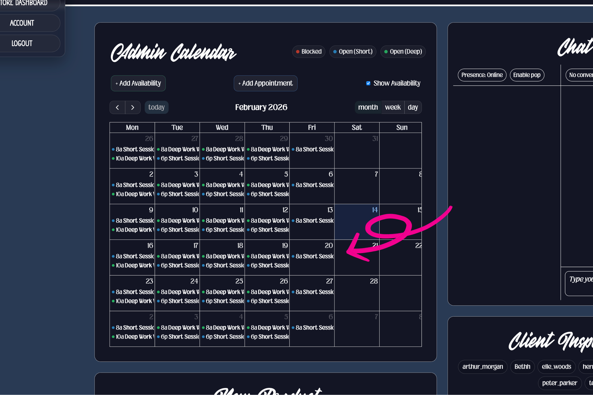 The logic behind this entire system is derived inside my calendar. From my admin dashboard, I am able to manage my calendar by setting availability, blocking out sections of time for certain types of projects, and scheduling in 30-minute block intervals.